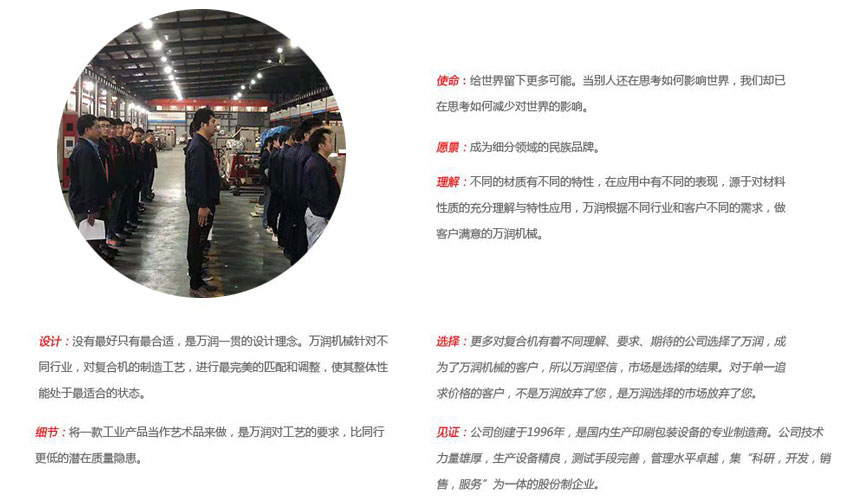 溫州萬潤機械有限公司(原瑞安市意聯機械有限公司)位于浙江省最前沿的東海之濱瑞安市。距機場,火車站30多公里,緊靠104國道,交通便利。公司創建于1996年,是國內生產印刷包裝設備的專業制造商。
