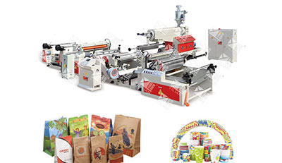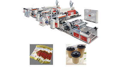 整機由加料裝置、擠出機主機、模具、放卷機構、復合機構、收卷機構、邊位控制裝置、切邊裝置、加熱冷卻系統、電氣測控系統等部分組成。根據不同制品需要可添加第二放卷機構、印刷設備、烘箱、基材表面處理裝置(電暈機等)、在線測厚儀等組成部分。 前道工序設備:造粒機,印刷機或其他設備;后道工序